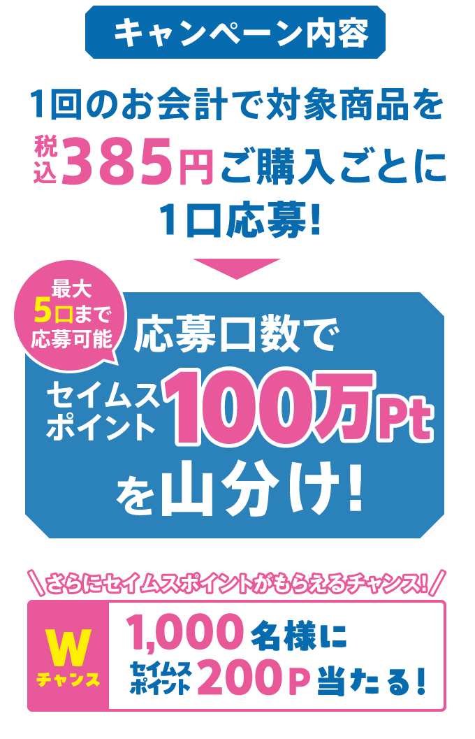 店舗にて対象商品を、1回のお買い物で税込385円以上ご購入ください。