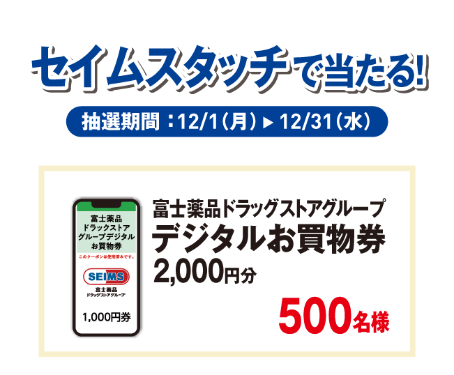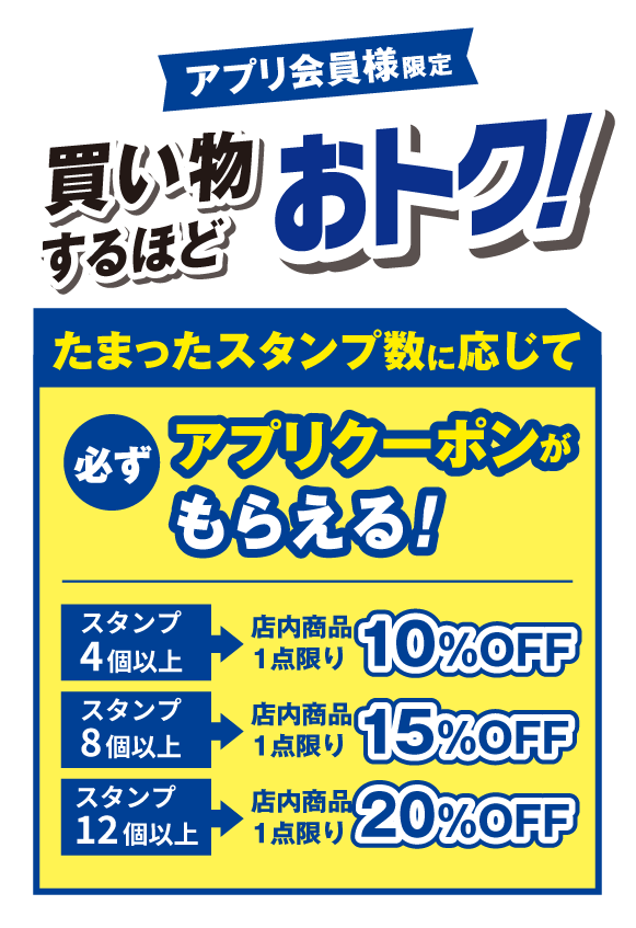 店内商品を、1回のお買い物で合計税込500円ご購入ごとに、スタンプを1個進呈します。 ご購入時に必ずセイムスカード、またはセイムスアプリ会員証をご提示ください。