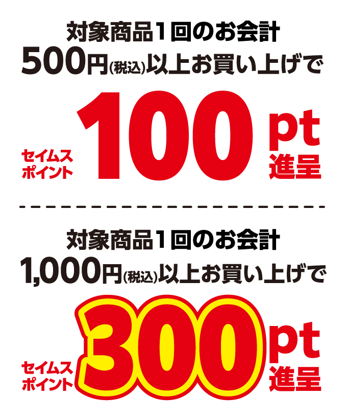 - 対象商品だけで1回のお会計金額税込500円に達しない場合、獲得セイムスポイント数に反映されません。