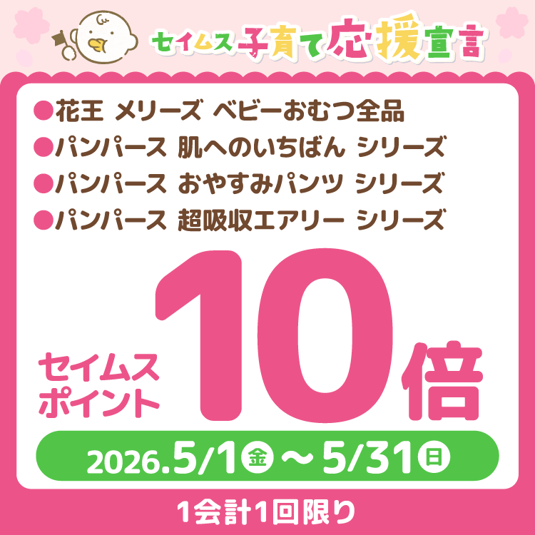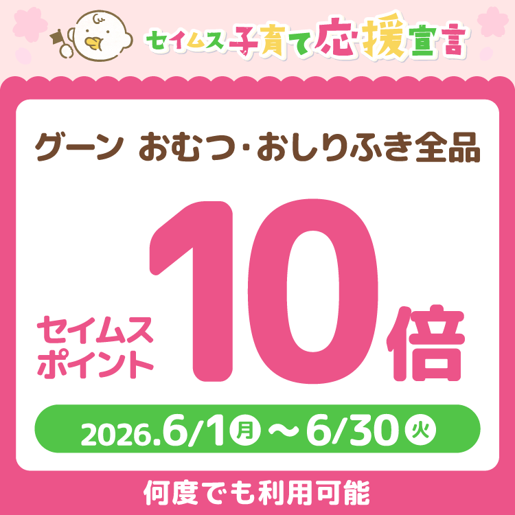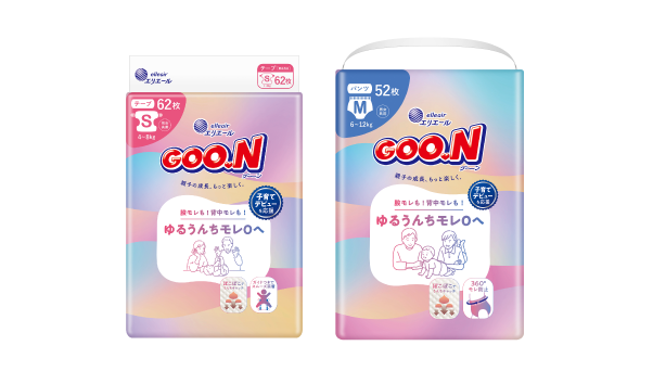 パンツ:ゆるゆるうんち時期は「ゆるうんちポケット」搭載のS・M寝返り~はいはいサイズ、うんちが固くなってたっちができるようになったら「すっぽりハイウエスト搭載のMたっち~ビッグ大サイズ