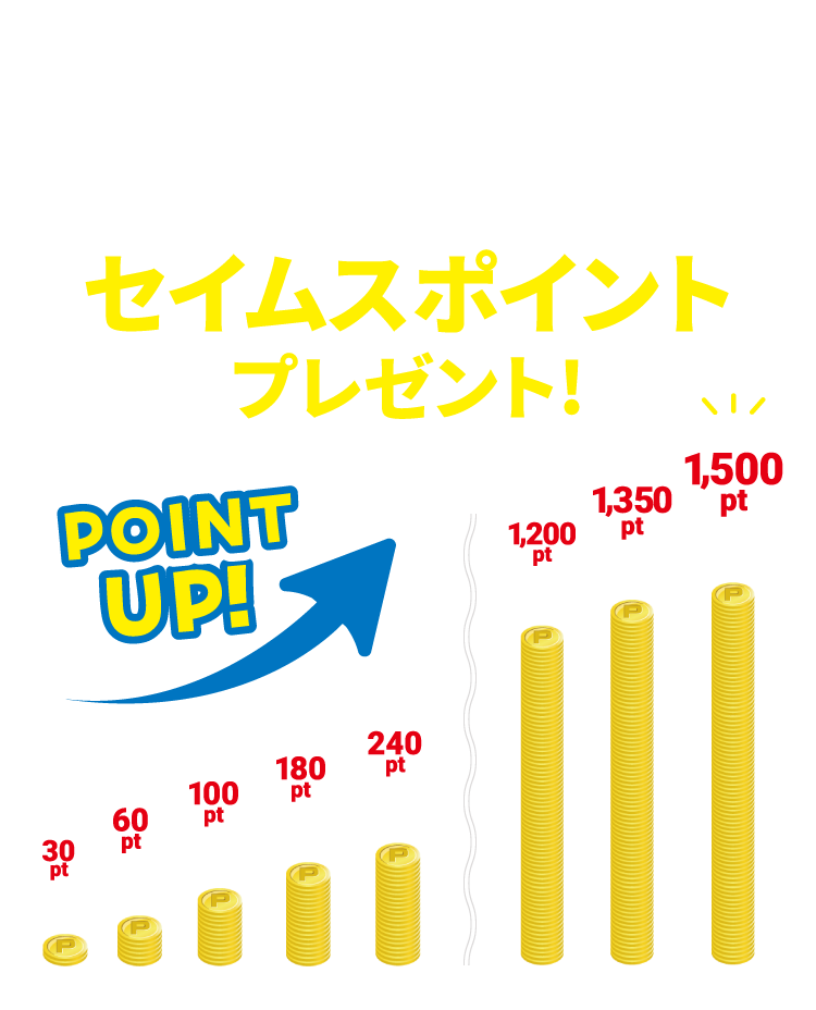 - セイムスポイントはキャンペーン終了月、翌月の中旬ごろ進呈予定です。諸事情により、セイムスポイントの進呈が多少前後する場合もございます。あらかじめご了承ください。